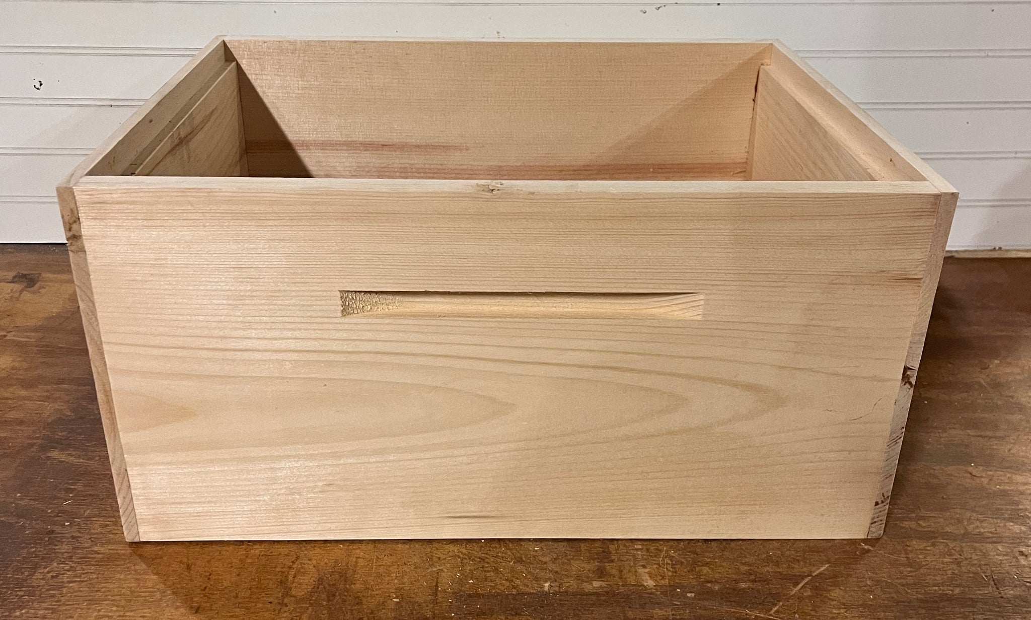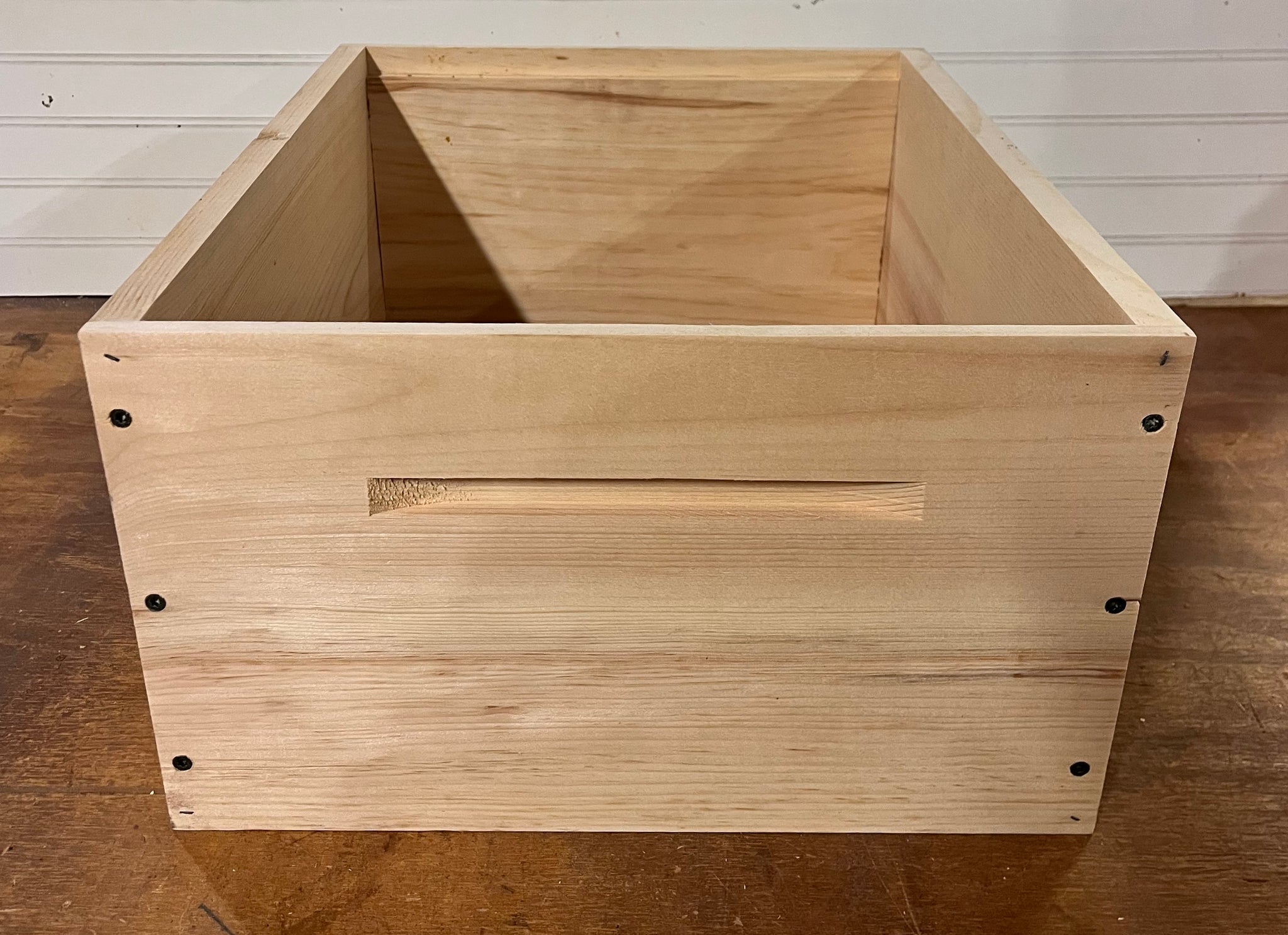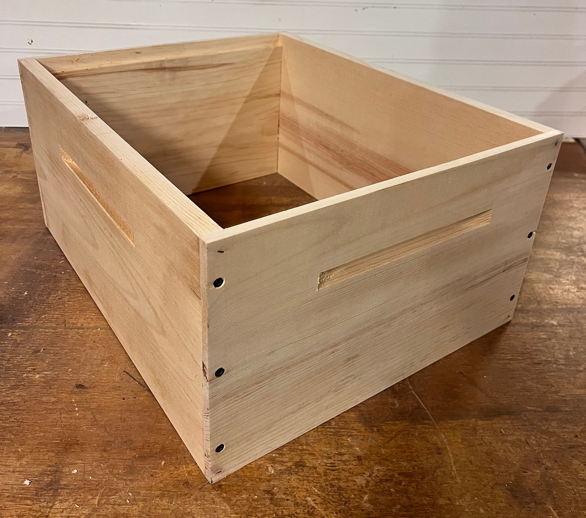 Assembled deep hive body. Used for brood and can be used for honey supers but they get real heavy when full. We use medium boxes for supers since they are a bit lighter.